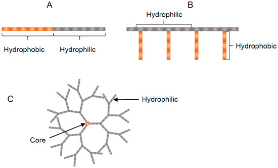 Schematic representation of amphiphilic polymer architectures: (A) Block copolymer; (B) Graft polymer and (C) Dendrimer.