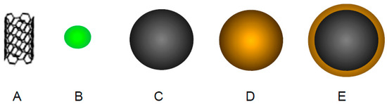 Schematic representation of inorganic nanoparticles: (A) Carbon nanotube; (B) Quantum dot; (C) Iron oxide; (D) gold and (E) iron oxide-gold.