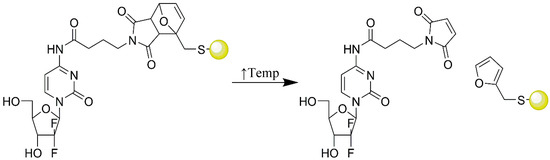 Schematic representation of hybrid nanoparticle with gemcitabine coupled onto its surface via a Diels Alder cycloadduct and its subsequent retro Diels Alder reaction after heating, liberating free gemcitabine.