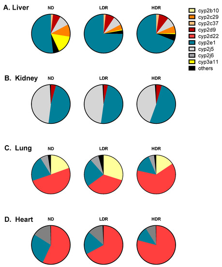 Cyp450 mRNA pie charts. Total mRNA transcripts for each isoenzyme are displayed as expressed in C57BL6 mouse microsomes according to diet group: (A) Liver; (B) Kidney; (C) Lung; and (D) Heart. ND, Normal diet; LDR, low-diet responders; and HDR, high-diet responders. Cyp450 mRNA transcript with a relative contribution >1% are illustrated, and “others” have a relative contribution <1%. Others include the following isoforms: Liver, cyp2b10, cyp2b29, cyp2c39, cyp2c40, cyp2d22, cyp2j6, cyp3a13, cyp3a25, and cyp4a10; Kidneys, cyp2b10, cyp2b29, cyp2c29, cyp2c37, cyp2c39, cyp2c40, cyp2d22, cyp2j6, cyp3a11, cyp3a13, cyp3a25, and cyp4a10; and Lungs, cyp2b29, cyp2c29, cyp2c37, cyp2c39, cyp2c40, cyp2d9, cyp2j5, cyp3a11, cyp3a13, cyp3a25, and cyp4a10.