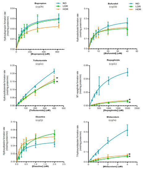 Hepatic cyp450 activities of cyp2b (bupropion), cyp2c (tolbutamide and repaglinide), cyp2d (bufuralol), cyp2e (chlorzoxazone), cyp2j (ebastine), cyp3a (midazolam) and cyp4a (dodecanoic acid) in C57BL6 mice fed a normal diet (ND) or a HFD (LDR, low-diet responders; and HDR, high-diet responders after an eight-week period of treatment). Data were expressed as the mean ± S.D. LDR or HDR vs. ND; * p < 0.05. N/F; activity not found, N/A; Not Available (in vitro incubation could not be determined) and dotted line represents the limit of quantification.