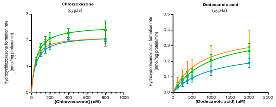 Real-time quantitative PCR was performed using TaqMan® probe and primer sets from Applied Biosystem (Foster, CA, USA). The assay IDs for selected cyp450s were: cyp2b9 (Mm00657910_m1), cyp2b10 (Mm01972453_s1), cyp2c29 (Mm00725580_s1), cyp2c37 (Mm00833845_m1), cyp2c39 (Mm04207909_g1), cyp2c40 (Mm04204172_mH), cyp2d9 (Mm00651731_m1), cyp2d10 (Mm00731648_m1), cyp2d22 (Mm00530542_m1), cyp2e1 (Mm00491127_m1), cyp2j5 (Mm00487292_m1), cyp2j6 (Mm01268197_m1), cyp3a11 (Mm00731567_m1), cyp3a13 (Mm00484110_m1), cyp3a25 (Mm01209536_m1) and cyp4a10 (Mm01622743_g1). As reference genes, gapdh (Mm99999915_g1) and b2m (Mm00437762_m1) were used as housekeeping genes. cDNA was diluted to 10 ng/reaction, mixed with TaqMan® PCR Master Mix (10 µL) and amplified using cycling conditions as follows: 45 cycles consisting of 10 s at 95 °C and 45 s at 60 °C. Reactions were run in a QuantStudio 6 Flex System (Life Technologies Inc., Burlington, ON, Canada).