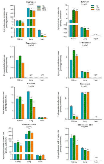 Extrahepatic cyp450 microsomal activities for cyp2b (bupropion), cyp2c (tolbutamide and repaglinide), cyp2d (bufuralol), cyp2e (chlorzoxazone), cyp2j (ebastine), cyp3a (midazolam) and cyp4a (dodecanoic acid) measured in the kidneys, lungs and heart in C57BL6 mice fed a normal diet (ND) or a HFD (LDR, low-diet responders; and HDR, high-diet responders after an eight-week period). Bars and error bars represent the mean ± SD, respectively. LDR or HDR vs. ND; * p < 0.05, ** p < 0.01, *** p < 0.001. N/F; activity not found, N/A; Not Available (in vitro incubation could not be determined) and dotted line represents the limit of quantification.