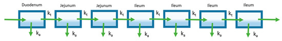 A later model of oral absorption that was introduced following the mixing tank model was the compartmental absorption and transit (CAT) model described by Yu et al. [17]. This model characterizes the intestinal tract as a series of compartments as opposed to a single compartment used by the mixing tank model. While a multiple compartment approach has been used prior to describe effects such as gastric emptying, Yu et al. utilized multiple compartments to represent different sections of the small intestine (Figure 3) [18,19,20,21]. Specifically, they found that the number of compartments that best fit the small intestine transit time, based on available literature, was seven. The first of the seven compartments represented the duodenum, the next two represented the jejunum, and the final four compartments represented the ileum. The transit of a drug through each small intestine compartment in CAT models is controlled by a transit rate constant (kt). The movement of drug through the CAT model can be mathematically represented by the following equation: