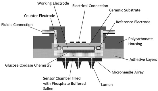 The most promising applications for microneedle-integrated biosensors is continuous monitoring of biomolecules from the skin’s ISF. Jina et al. [82] developed a hollow microneedle-integrated continuous glucose monitoring (CGM) biosensor, and demonstrated accurate and continuous glucose measurements in humans using ISF up to 72 h. The sensing chamber (Figure 3), located behind the microneedle array, was filled with a buffer solution to transfer glucose passively from ISF to sensor, eliminating the need for removal of ISF from the skin [82]. The main advantages of this system are lack of volume requirement for ISF extraction, real-time bioanalysis, and limited number of steps to obtain bioanalytical results [74].