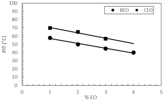 Relationship between the percentages of essential oil (EO) in NLC BEO1–4 and CEO1–3, and the corresponding phase inversion temperature (PIT) values determined during their preparation.