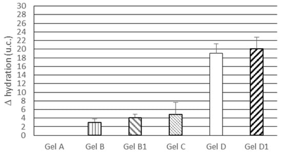 Skin hydration difference (Δ hydration) between baseline values and values recorded after a one-week treatment with the gels under investigation. Statistically significant differences (p < 0.05) were observed for the following comparisons: all gels vs. gel A; gel D vs. gels B, B1 and C; gel D1 vs. gels B, B1 and C.