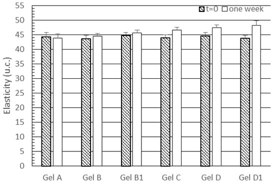 Skin elasticity values recorded before treatment (t = 0) and after a one-week treatment with the gels under investigation. Statistically significant differences (p < 0.05) were observed after one week for the following comparisons: gel C vs. gels A, B, B1, D and D1; gel D vs. gels A, B, B1 and C; gel D1 vs. gels A, B, B1 and C.