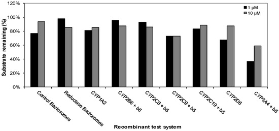 Metabolism of CRV431 (1 and 10 μM) by a panel of recombinant human CYP enzymes (50 pmol/mL).