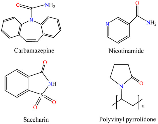 Molecular structure of carbamazepine, nicotinamide, saccharin, and polyvinyl pyrrolidone.