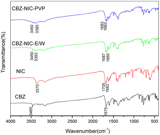 The IR spectra for starting material of CBZ, NIC, and CBZ-NIC cocrystal screening products are shown in Figure 2. IR spectrum for CBZ has two characteristic peaks at 3465, 1675 cm−1, which correspond to the stretching of amine (NH2) and carbonyl (C=O) group of CBZ. The IR spectrum for NIC has a characteristic peak at 3370 cm−1 for the stretching of amine group and double characteristic peaks at 1705 and 1683 cm−1 for the stretching of carbonyl group. The IR spectrum of cocrystal screening product CBZ-NIC-E/W is different from that of the starting material of CBZ or NIC. The characteristic peak of CBZ in CBZ-NIC-E/W has red shift from 3465 and 1675 cm−1 to 3450 and 1660 cm−1, respectively. The characteristic peak of NIC in CBZ-NIC-E/W has a blue shift to 3393 and 1687 cm−1. The characteristic peak shift can be explained by the formation of H-bond, and the IR spectrum features of sample CBZ-NIC-E/W are in agreement with that of CBZ-NIC cocrystal [9,35]. IR characterization results can preliminarily demonstrate the formation of CBZ-NIC cocrystal in ethanol-water solvent mixture. For sample CBZ-NIC-PVP, its IR spectrum has shown some difference from that of CBZ and NIC. The CBZ characteristic peak has shifted to 3450, 1663 cm−1. However, an obvious peak at 1683 cm−1 corresponding for NIC can still be observed, which demonstrated the existence of NIC. IR results preliminarily demonstrate that the possibility of formation of pure CBZ-NIC cocrystal in PVP solutions has been eliminated.