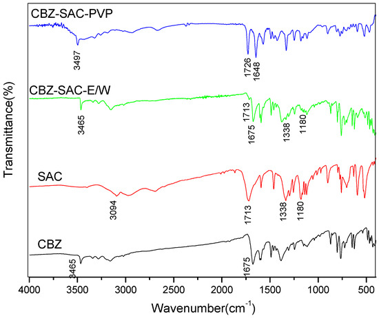 IR spectra of carbamazepine (CBZ), saccharin (SAC), CBZ-SAC cocrystal screening product prepared in ethanol-water mixture (CBZ-SAC-E/W) and in polyvinyl pyrrolidone solution (CBZ-SAC-PVP).