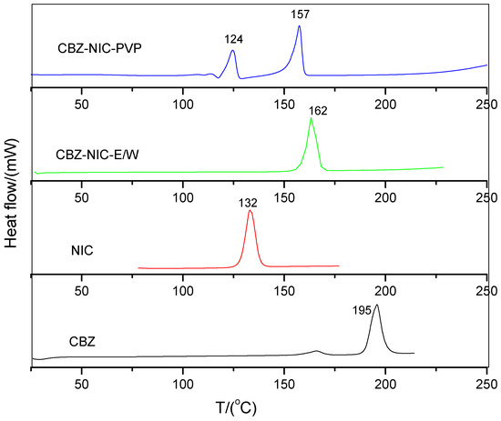 Differential Scanning Calorimetry (DSC) curves of CBZ, NIC, CBZ-NIC-E/W, and CBZ-NIC-PVP.