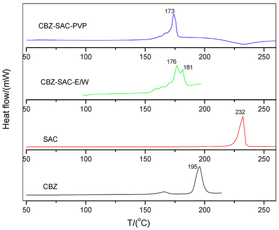 DSC curves of CBZ, SAC, CBZ-SAC-E/W, and CBZ-SAC-PVP were shown in Figure 5. For sample CBZ-SAC-E/W, the two overlaid peaks of 176 and 181 °C indicate that this sample is a physical mixture. The two starting materials in the mixture melt one after another in a broad melting range at relative lower temperature compared to their pure state. Sample CBZ-SAC-PVP shows a single endothermal peak at 173 °C, corresponding to the melting point of CBZ-NIC cocrystal [36]. DSC analyses further demonstrate the formation of pure CBZ-SAC cocrystal in PVP solution.