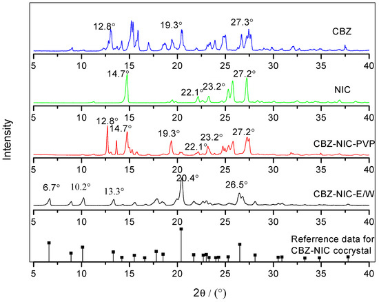 Powder X-ray diffraction (PXRD) spectra of CBZ, NIC, CBZ-NIC-PVP, CBZ-NIC-E/W, and CBZ-NIC-cocrystal.