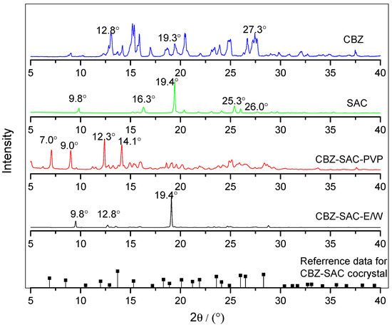 PXRD spectra of CBZ, SAC, CBZ-SAC-E/W, and CBZ-SAC-PVP.