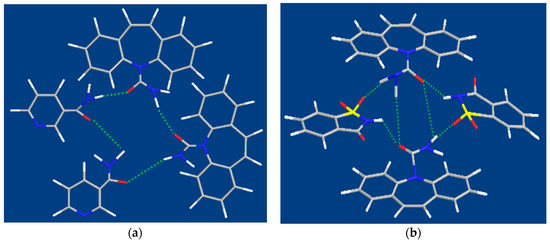 Illustration of the interaction between CBZ and coformer in cocrystal. (a) CBZ-NIC cocrystal (b) CBZ-SAC cocrsytal.