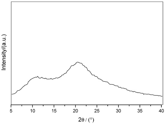 In this study, the effects of PVP on CBZ-NIC and CBZ-SAC cocrystal formation process have been researched. PVP is one of the most researched polymers made from the monomer of N-Vinyl-2-pyrrolidone, which has been widely used in the food and pharmacy industries as an additive or excipient [27,30,31,32,33,34]. In the macromolecule structure of PVP, it has both flexible long carbon chain and side ring groups, pyrrolidinone, which offer some rigid property to PVP structure. The flexible chain and the rigid side group together can impart PVP adjustable steric structure properties. PVP is highly soluble in water, ethanol, and other polar solvents. The solubility of PVP in water/ethanol is about 1000 mg/mL. In this study, PVP could remain dissolved state in solution due to its high solubility. PVP has a broad endothermal peak around 50–100 °C [40,41,42], which is not observed in DSC curves of any cocrystal screening products. Besides, the PXRD spectrum of PVP, shown in Figure 9, has broad peaks around 11° and 20° corresponding to the PVP crystalline phase, although PVP has a poor crystallinity degree. While these characteristic broad peaks of PVP have not been found in PXRD spectrum of any samples prepared in PVP solutions. The test results of DSC and PXRD demonstrate that PVP did not precipitate during the cooling and slow evaporation cocrystal preparation process.