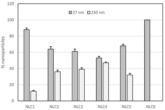 Percentages of nanoparticles with small size (27 nm) and large size (230 nm) in NLC1–6.