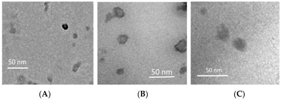 Transmission electron microscopy (TEM) images of lipid nanocarriers containing RSV 1% w/w. (A) NE RSV; (B) SLN RSV; (C) NLC6 RSV.