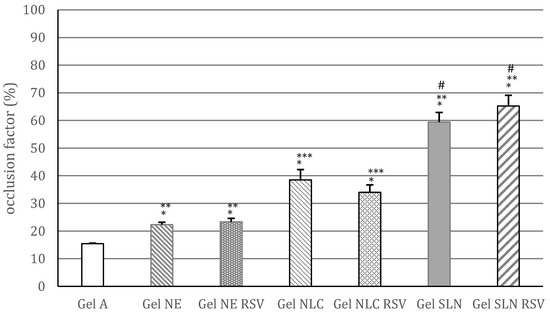 Occlusion factor (%) of gels without lipid nanocarriers (gel A), containing unloaded NE (gel NE), NLC6 (gel NLC), SLN (gel SLN) or 1% w/w RSV loaded NE (gel NE RSV), NLC6 (gel NLC RSV) and SLN (gel SLN RSV). Statistical analysis for the comparison: * p < 0.05 vs. gel A (control); ** p < 0.05 vs. all other gels; *** p < 0.05 vs. all other gels; # p < 0.05 vs. all other gels; p > 0.05 for the comparisons: gel NE vs. gel NE RSV, gel NLC vs. gel NLC RSV, gel SLN vs. gel SLN RSV.