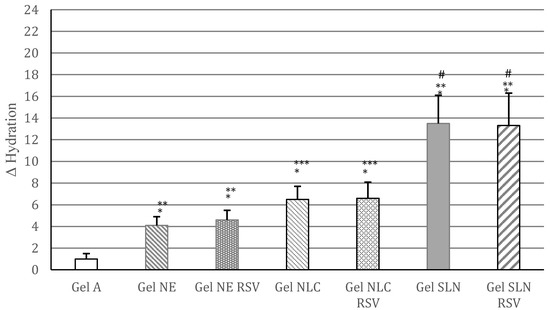 The differences of skin hydration (Δ hydration), recorded after one-week in vivo topical treatment with the gels under investigation, are shown in Figure 5. Gel A, which did not contain lipid nanocarriers, provided only a very slight increase of skin hydration. On the contrary, topical application of gels containing lipid nanocarriers led to a significant increment of skin hydration in the following order SLNs > NLCs > NEs. However, no significant difference (p > 0.05) was observed between gels containing unloaded and the corresponding RSV loaded lipid nanocarriers, thus suggesting that RSV incorporation in these nanocarriers was not able to improve further skin hydration. Therefore, although RSV loading into SLN and NLC could be a useful strategy to improve RSV topical antioxidant activity [25,37], this approach did not bring any benefit to skin hydration in a short-term treatment.