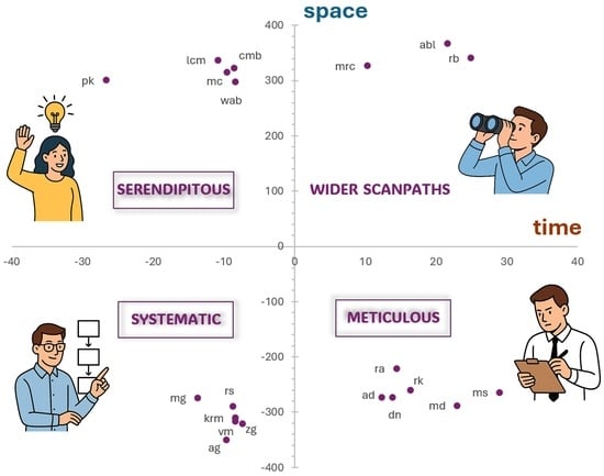 In data visualization, users’ scanning patterns are as crucial as their reading patterns in text-based media. Yet, no systematic attempt exists to characterize this activity with basic features, such as reading speed and scanpaths, nor to relate them to data complexity and information disposition. To fill this gap, this paper proposes a model-based method to analyze and interpret those features from eye-tracking data. To this end, the bias-noise model is applied to a data visualization eye-tracking dataset available online, and enriched with areas of interest labels. The positive results of this method are as follows: (i) the identification of users’ reading styles like meticulous, systematic, and serendipitous; (ii) the characterization of information disposition as gathered or scattered, and of information complexity as more or less dense; (iii) the discovery of a behavioural pattern of efficiency, given that the more visualizations were read by a participant, the greater their reading speed, consistency, and predictability of reading; (iv) the identification of encoding and title areas of interest as the primary loci of attention in visualizations, with a peculiar back-and-forth reading pattern; (v) the identification of the encoding area of interest as the fastest to read in less dense visualization types, such as bars, circles, and lines charts. Future experiments involving participants from diverse cultural backgrounds could not only validate the observed behavioural patterns, but also enrich the experimental framework with additional perspectives.