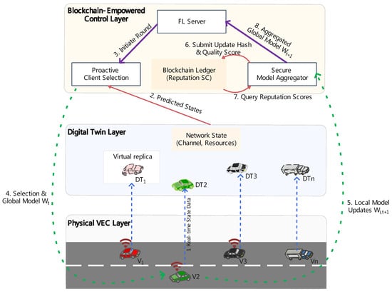 Federated learning (FL) is a foundational technology for enabling collaborative intelligence in vehicular edge computing (VEC). However, the volatile network topology caused by high vehicle mobility and the profound security risks of model poisoning attacks severely undermine its practical deployment. This paper introduces DTB-FL, a novel framework that synergistically integrates digital twin (DT) and blockchain technologies to establish a secure and efficient learning paradigm. DTB-FL leverages a digital twin to create a real-time virtual replica of the network, enabling a predictive, mobility-aware participant selection strategy that preemptively mitigates network instability. Concurrently, a private blockchain underpins a decentralized trust infrastructure, employing a dynamic reputation system to secure model aggregation and smart contracts to automate fair incentives. Crucially, these components are synergistic: The DT provides a stable cohort of participants, enhancing the accuracy of the blockchain’s reputation assessment, while the blockchain feeds reputation scores back to the DT to refine future selections. Extensive simulations demonstrate that DTB-FL accelerates model convergence by 43% compared to FedAvg and maintains 75% accuracy under poisoning attacks even when 40% of participants are malicious—a scenario where baseline FL methods degrade to below 40% accuracy. The framework also exhibits high resilience to network dynamics, sustaining performance at vehicle speeds up to 120 km/h. DTB-FL provides a comprehensive, cross-layer solution that transforms vehicular FL from a vulnerable theoretical model into a practical, robust, and scalable platform for next-generation intelligent transportation systems.
