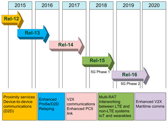 D2D communications support in 3rd Generation Partnership Project (3GPP) releases; V2X: Vehicle-to-Everything; Rel: Release; RAT: Radio Access Technology.