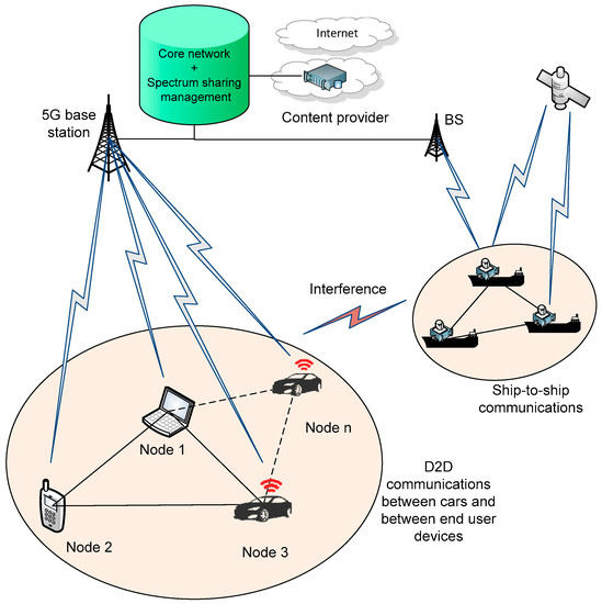 Figure 4 presents our high-level system model for D2D communications in a 5G network. There are many types of users that are connected to the base stations using cellular interfaces. Nodes can also communicate directly using D2D communication links between nodes that are in proximity to each other. Direct links between user devices such as phones and laptops may use several RATs, including 3GPP evolution, as described in Section 2, Bluetooth, or WiFi standards. Cars also use a dedicated 802.11p standard in the intelligent transport system (ITS) band in 5.9 GHz for V2X communications. In the future, autonomous and remote-controlled ships will also use more and more ship-to-ship communications, possibly also radios specifically developed for these purposes. Both in the V2X communications among cars and in maritime communications, integrated 5G satellite-terrestrial systems will be needed [8,9].