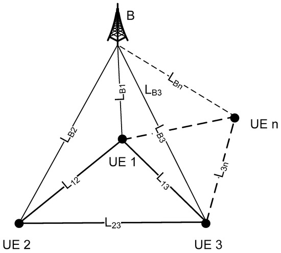 Let us now look at the simplified model for the analysis that is presented in Figure 5. The model is based on the high-level system model described above. Wireless mobile users are connected to the base station using the LTE interface. There are N nodes in the network. We assume that links L12 (between Node 1 and Node 2), L13, L23, L3n can be either LTE or WiFi links. Only user equipment such as phones, tablets, and laptops are used as nodes in the network. Link attenuations between the base station and the user equipment are assumed to be equal, as well as the direct links between nodes. All the links between the user equipment and the base station are using 3GPP interfaces.