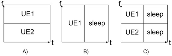 Resource allocations in the time and frequency domains in the defined use cases are presented in Figure 6. Cooperation leads to a shorter active transmission period of the base station in all co-operative scenarios. The figure shows an example with two nodes (UEs) but the same model can be easily generalized to N users. The energy required for the transmission of data is the integral of the power consumption of the air interface over time