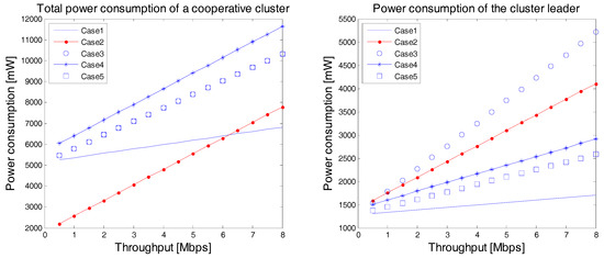 Figure 7, Figure 8 and Figure 9 show power consumption results with the defined power consumption models from the end user perspective. All used WiFi and LTE models are applicable to out-of-band D2D communication scenarios. In addition, the LTE models are applicable to in-band overlay D2D where D2D links use dedicated resources. The power consumption of the total D2D network, as well as the power consumption of the cluster head of a network in each case, is given in Figure 7 for a cluster size of N = 4 nodes using the Huang model [19] for the LTE and WiFi interfaces. It is seen that with the low throughput values it is best that only the cluster head actively receives the data from the LTE base station. Then it uses WiFi for relaying the data to requesting users. However, it can be seen that from the cluster head perspective this is the second most power consuming option and thus there might be a need to change the cluster head from time to time in order to prevent it draining the battery completely. When the higher throughput >6 Mbps is required, the most power efficient option from the end user perspective is to receive all the data directly from the base station.