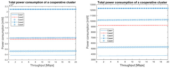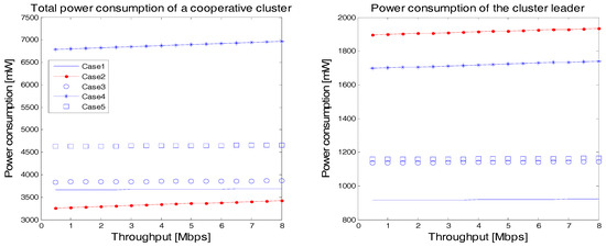 The power consumption of the cluster head is given in Equations (8) and (9) by excluding the last term in the equation. In cases 4 and 5, the power consumption is equally shared between the nodes.