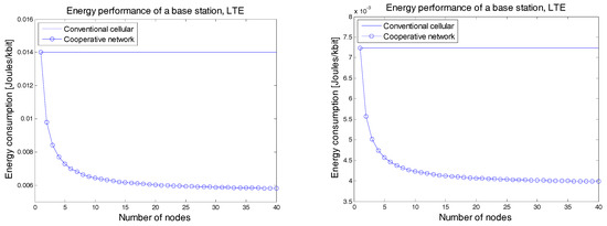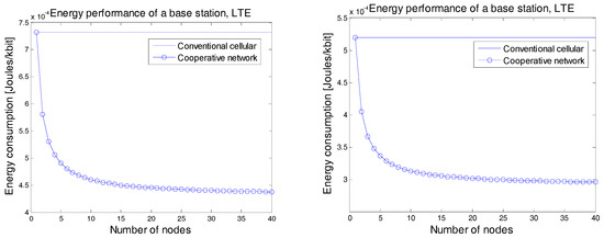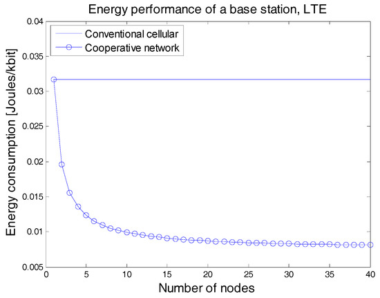 We assume an average bit rate of 10 Mbit/s in the following figures and use the energy consumption models of Equations (13) and (14). The transmission power is set according to the values in Table 2. The results presented in Figure 10 for a macro base station show that with this data rate conventional cellular transmission consumes roughly 0.3 J/kbit, whereas the cooperation clearly reduces the energy consumption by sharing the load among cooperative nodes. The effect is the largest with a few additional cooperative nodes, three nodes already lead to 50% energy savings. When the number of nodes is increased to more than 10 nodes, the energy consumption of a base station is around 0.1 J/kbit which means that the base station is able to serve the requesting nodes with one third of the original energy. This is a significant improvement in the energy efficiency.