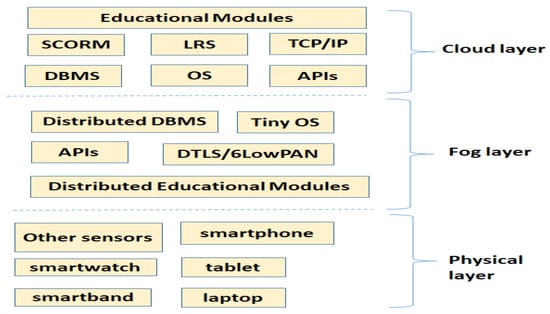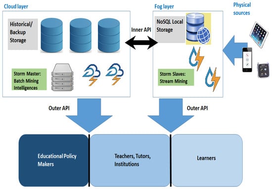 As a direct consequence of the adoption of these technologies, educational big data mining is emerging as a novel research scenario [], wherein big data and big data stream mining techniques may be applied to the valuable information coming from different educational data sources, be they either sensor-like gadgets (e.g., wearables) or full-fledged devices (e.g., tablets and laptops). Moreover, these new scenarios allow one to offer a partial solution to the most common legacy issues connected with distance learning environments and educational data mining techniques, such as the requirement for: (i) increasing scalability (considering both infrastructure and algorithms); (ii) real-time responsiveness (for quick responses towards students’ requirements and needs); and (iii) adaptivity (since workload peaks may rapidly follow more quiet periods). In the light of all said and to cope with the increased demand of scalable and adaptive analytics, this article presents a layered functional architecture enabling time-efficient analysis of educational big data streams through an effective usage of big data stream and fog computing technologies combined together. The envisioned architecture has been implemented in a preliminary version and has provided some good results in thwarting dropouts of students of a distance learning university.