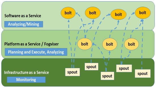 Besides this, another concept, namely Fog Computing (FC) [], is quickly arising as the perfect companion of big data streams: as a matter of fact, the goal of this emerging paradigm is to reduce the amount of data that needs to be transported to the cloud for processing, analysis and storage. Such a technology improves the overall efficiency and real-timeliness, by migrating computing resources, applications and services to the edges of the network.