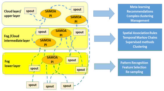 Big streams of data, coming from IoT devices, generate huge amounts of information, which can be subsequently processed and used to build several useful services for final users. The cloud, and its rack-mounted, warehouse-like data centers, made up the natural collection environment for big data, due to its scalability, robustness and cost-effectiveness. However, Figure 1 shows how recent architectures are moving towards a hierarchy of different levels involved in data collection, and among these, we can clearly distinguish the fog layer, usually populated with smart gateways being closer to sensors and smart devices than to cloud servers. Fog computing [,] is a recently-emerging paradigm, whose aim is to extend cloud elaboration and services to the edge of the network, by relying on the proximity to end-users, the dense geographical distribution and the support for mobility that IoT devices may guarantee, even in case of network connection unavailability. Fog specifically refers to IoT gateways, and these are indeed the so-called fog nodes, while edge computing considers the intelligence to be put further down, directly to the end devices. Both scenarios consider intelligent objects or devices equipped with proper software such as Cisco IOx (http://developer.cisco.com/site/iox/), Cisco Data In Motion (DMo) (http://developer.cisco.com/site/data-in-motion/discover/overview/), LocalGrid (http://www.localgridtech.com/) or PrismTech Vortex (http://www.prismtech.com/vortex). The wide geographical distribution and the moving of intelligence and computational power to the borders of the network make the fog computing paradigm particularly suited to real-time big data stream analytics, as presented in Section 3.1, both to foster new adaptive mining techniques while promoting analyses based on time and location information. In this perspective, the fog computing architecture is not meant to completely replace the cloud, but rather to complement it and interplay with it. As a matter of fact, fog computing corroborates cloud computing, and they both share the same resources, as well as many of the same mechanisms and attributes. The following innovative features are typical of the fog paradigm and enrich cloud-based architectures: