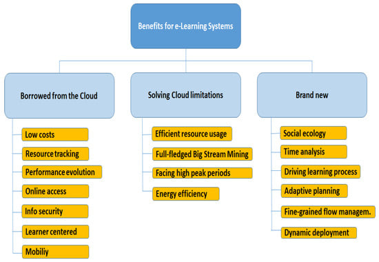 Big stream and fog computing may benefit e-learning infrastructures according to three different types of advantages.