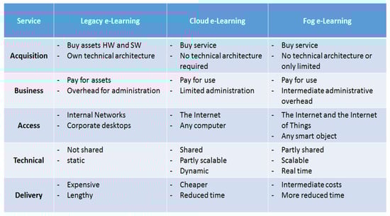 Comparison of traditional e-learning systems, cloud-based ones and fog-based ones according to different service models.