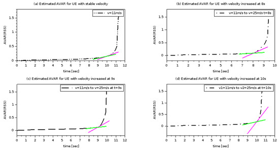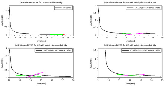 To study the case where the UE equipment approaches the source of the access point (AP) we chose to track values of AVAR for the received RSS by the serving AP where the UE changed its velocity from 11 m/s to 25 m/s at t = 8, t = 9, and t = 10, as presented in Figure 2. For the three cases, the approves the condition being higher than 1% at the same time when the UE accelerated. In contrast, in the case where the velocity remains constant, the value of stays under 1%. We repeated this for the UE moving a far distance from the AP, and in accordance this time the UE changed velocity from 11 m/s to 25 m/s at t = 12, t = 14, and t = 16.