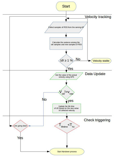 In view of Equation (3), we calculate the variance continuously in order to track and check if . Once this condition is fulfilled, the UE will use the global positioning system (GPS) to get the velocity value. At the point when the velocity is accessible, the lifetime () for the UE in the coverage area of the serving AP is recalculated utilizing the present velocity. Then, we confirm if () is greater than the time required to play out a handover (), else we should begin the handover procedure to maintain a strategic distance from the HOF. Figure 4 resumes the process. To limit the PP impact, we ought to get the () before becoming associated with the new AP.