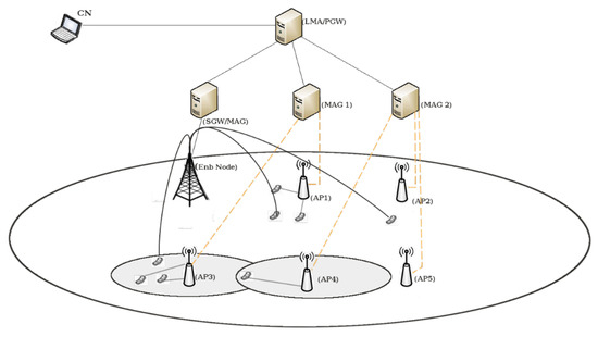 The theoretical model created in the previous section is assessed here. The proposed scheme was executed in Network Simulator 3 (NS3). In the scenario, we created 30 mobile UE units, with only 21 UE units moving. We configured two different technologies, the LTE and WiFi network, by designing one EnbNode for full coverage, and six overlapping APs, as presented in Figure 6. For PMIPv6 protocol we used one LMA and three MAGs, where the UE moved between different MAGs.