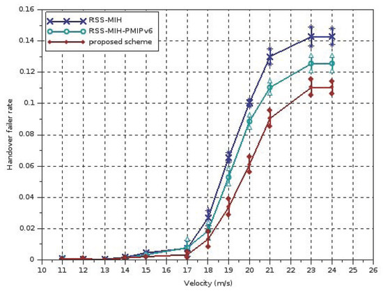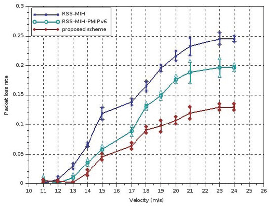 Handover failure has a fundamental role in the discontinuance of services, and it affects the packet loss rate. Since the handover is not achieved successfully, the association with another network consequently requires increased time. The packet loss rate, which denotes the ratio of packet loss value and the total number of sent packets, will be evaluated and presented over velocity in Figure 8. This demonstrates that our proposed system beats the RSS-MIH-PMIPv6 and RSS-MIH systems.