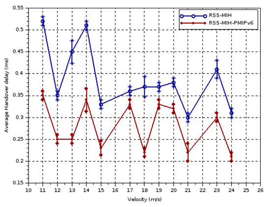 Figure 9 trick the normal handover delay of the UE moving at various speeds. It demonstrates that our proposed policy in RSS-MIH-PMIPv6 scheme outperforms the RSS-MIH scheme, and shows that handover delay diminishes proportionately as UE velocity grows. As an interpretation, we note that the quicker the UE travels, the shorter the time expected to surpass the distance in order to recognize the occurrence of new competitor BS. This helps to lessen the time-scanning interval. In addition, according to Table 3, at a velocity higher than 21 m/s the favored populace is the LTE network, in which the delay was enhanced by 0.15 ms since the lifetime condition encouraged the client to keep LTE as the only option. Along these lines, access to LTE is made specifically without passing through the resource availability stage.
