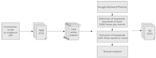 We divided the data acquisition process into different steps, as described below. To collect the data related to ICOs we used ICObench Data API, introduced on 12 December 2017 (according to https://medium.com/@ICObench/icobench-2017-in-numbers-d987b0a280d0), to study the list of all ICOs, the list of ICOs by search parameters and filters, the list of all ICOs ratings, all information in the ICO profile and other statistics. ICObench Data API has already been used in other major studies [27,28,29]. We called the extraction of this data “Step 1”.