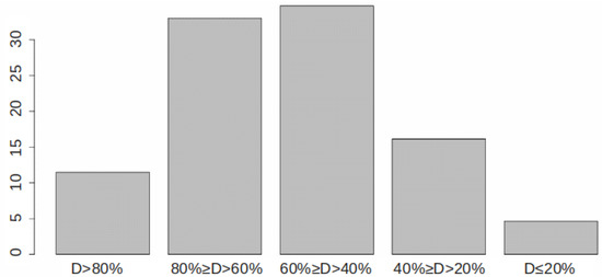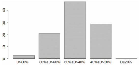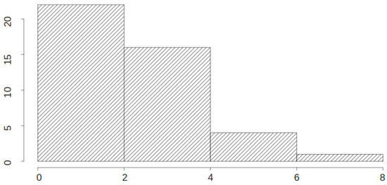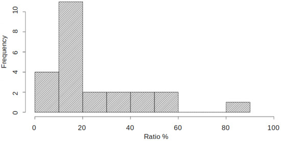 This distribution is not normal. The Anderson-Darling normality produces p-value < 2.2 × lower than . We then performed the Wilcoxon test and by its result we can see that the differences are significant. The p-value = 2.476 × is lower than the threshold value . This result is strongly contrary to the null hypothesis and then the observed data are statistically significant. The minimum value of Agile ICOs is 2.1.