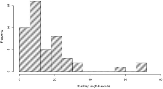 Histogram of the number of months of development described in the Agile ICO roadmaps.