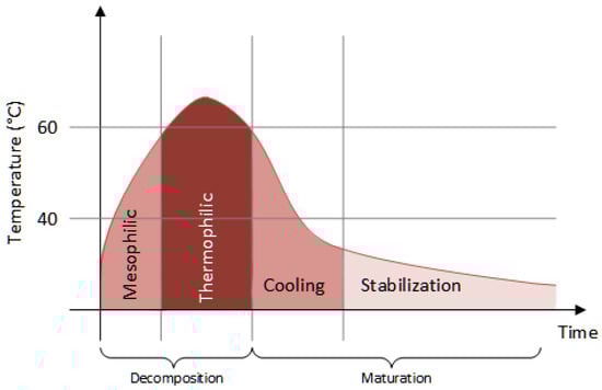 Composting and its benefits on agriculture have been known since the tenth century. Greeks and Romans knew about compost, a fact contained in tenth- and twelfth-century Arab writings, in medieval Church texts, and in Renaissance literature. Since then, as science evolved, compost has evolved with it. In general, compost is high-quality, nutrient-rich, inactive manure that detracts insects and pests. It is a natural soil curb that enhances organic-matter content and functions as a water reserve, preventing runoff and soil erosion, a characteristic that is typical in the Mediterranean due to its mostly hilly terrain []. To produce high-quality compost, it requires uninterrupted attention and intervention, and certain expertise in the field. The overall process is delicate and easily corrupted. Process corruption can lead to toxicity in the produced material that can be disastrous for agriculture []. The composting procedure is divided in two main phases, the decomposition and maturation phase. The decomposition phase is characterized by intense microbial activity, introduced by the rapid decomposition of the material. This phase is dissected in two subphases depending on the material’s temperature. In the first subphase (mesophilic), decomposition has just started, and temperature rises, reaching up to 60 °C. In the second phase (thermophilic), decomposition is in full extend and the temperature rises up to 65–70 °C. During these two subphases, the material’s moisture must be kept between 50% and 60%. Moisture decrease below 50% slows down or even stops the degradation process since, in order for the nutrients to be consumed by micro-organisms, they must be in the solution. Moisture increase above 60% renders the process anaerobic and results in contamination of the procedure. The overall duration of the first phase varies, from fifteen to thirty days. In the maturation phase, decomposition has finished, and the material starts to mature and settle. Temperature steadily drops, and the material volume starts to decrease. The overall duration of the second phase varies, from thirty to sixty days. Figure 1 illustrates the correlation of each phase with the material’s temperature.
