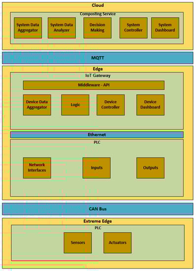 The proposed architecture is depicted in Figure 3 and comprises three main layers. The cloud, where the composting service is deployed; the edge, where the IoT gateway and the Programmable Logic Controller (PLC) are deployed; and the extreme edge, where the composting frame facilitates the composting procedure. The proposed architecture illustrates the decoupling of the composting “logic” from the edge and sent to the Cloud to allow for uninterrupted and ubiquitous service. To allow a more comprehensive explanation of the system’s architecture, we provide a top-to-bottom presentation.